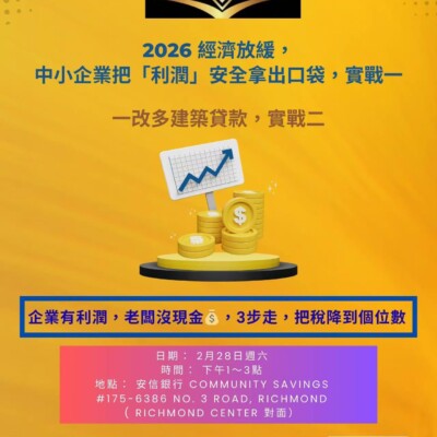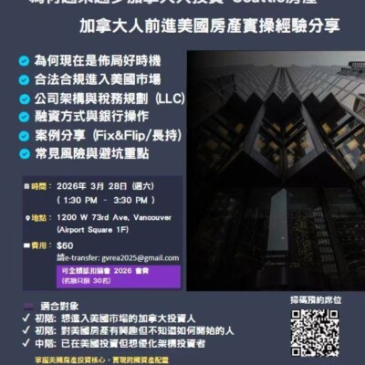 3/28 大溫地產協會將舉辦一場美國房產實戰說明會:從公司架構、融資策略,到真實投資案例與踩過的坑,一次講清楚、毫無保留。如果你也不想錯過下一波資產機會,歡迎來現場交流學習。名額有限,先報先贏!