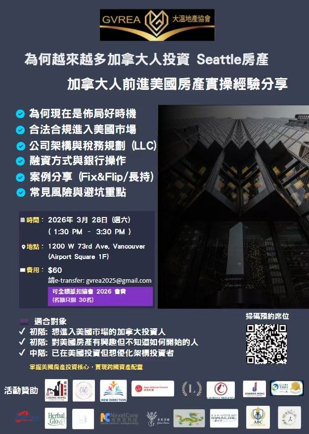 3/28 大溫地產協會將舉辦一場美國房產實戰說明會:從公司架構、融資策略,到真實投資案例與踩過的坑,一次講清楚、毫無保留。如果你也不想錯過下一波資產機會,歡迎來現場交流學習。名額有限,先報先贏!